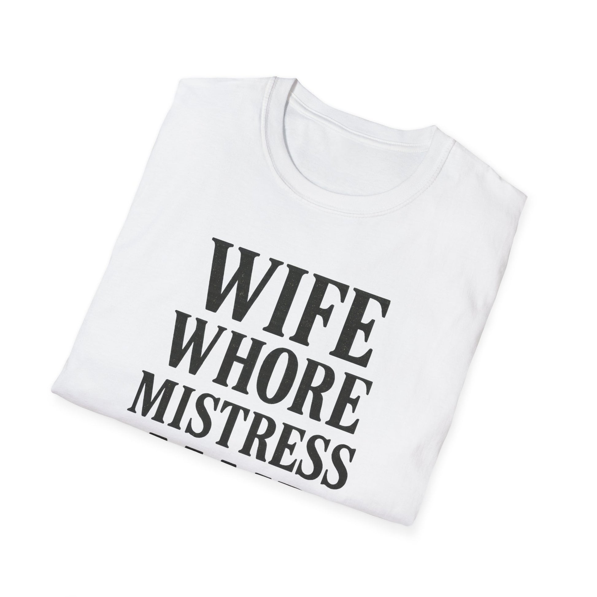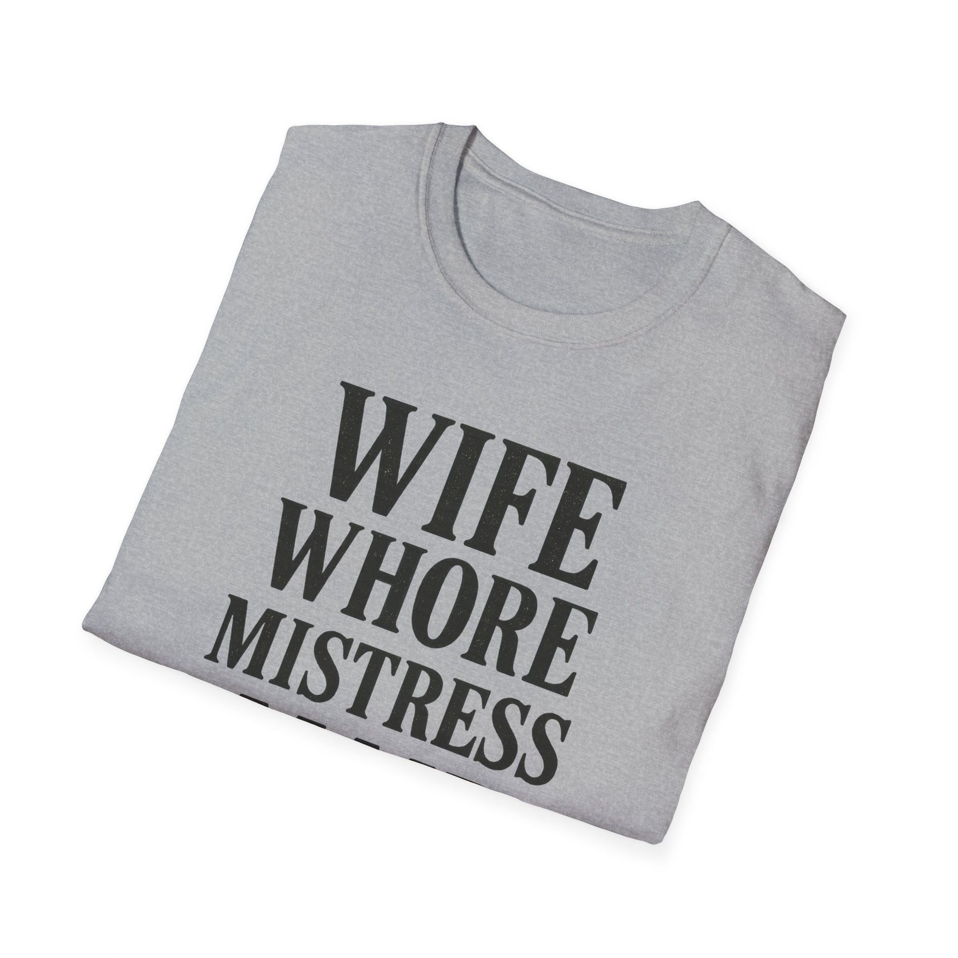 Witty Graphic Tee - 'Wife, Whore, Mistress, Maid, Mother' Unisex Softstyle T-Shirt, Casual Wear, Funny Gifts, Family Humor, Statement Shirt